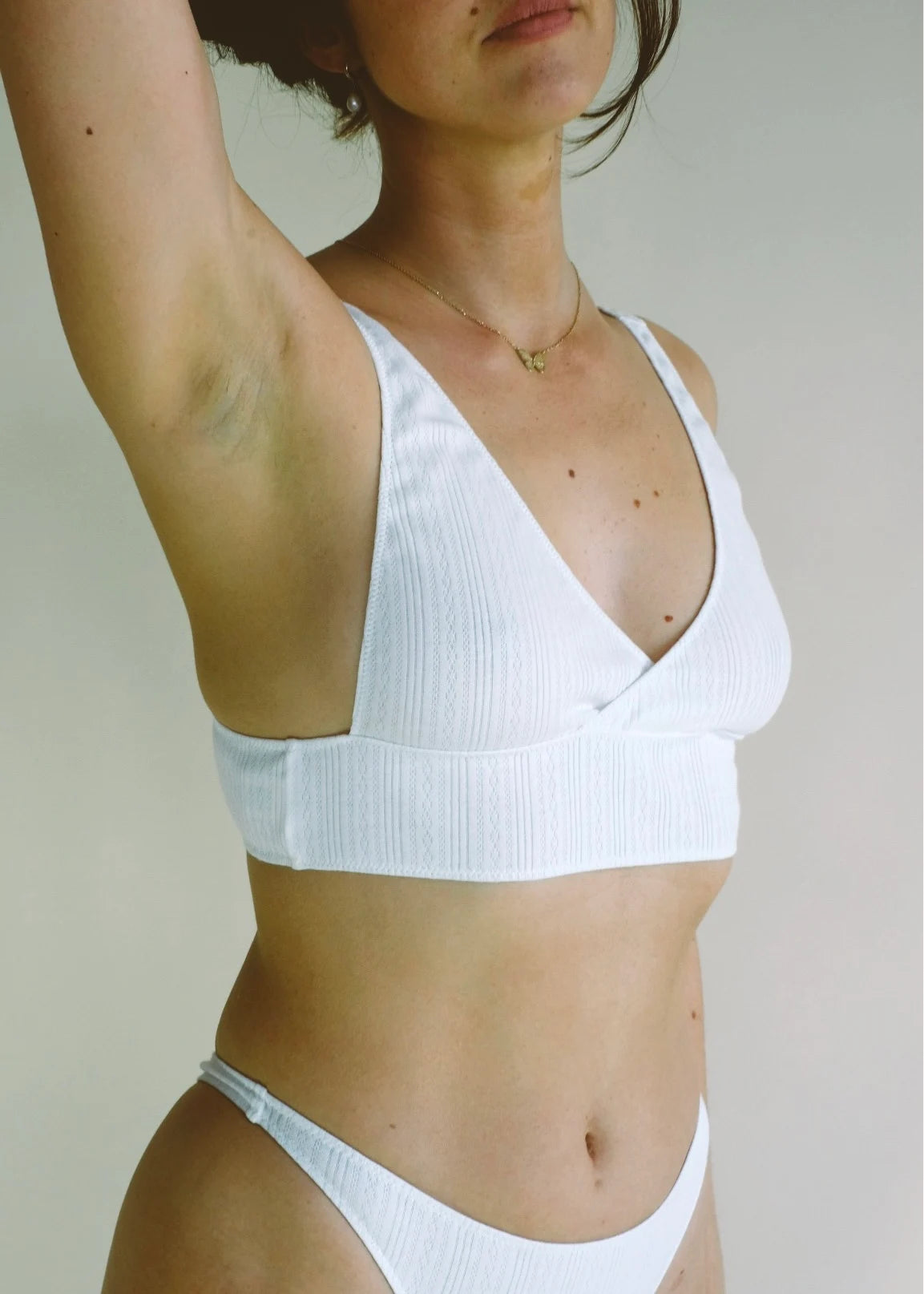Zaprojektowany tak, byś mogła oddychać swobodnie. Bez fiszbin, bez zapięć, bez plastiku. Tylko miękka bawełna i delikatne gumki w obwodzie. Miseczki wycięte tak, by subtelnie odsłonić kształt piersi.